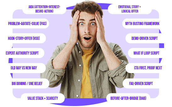 15+ proven frameworks like AIDA, PAS, Story‑Offer, Objection Handling, Myth Busting